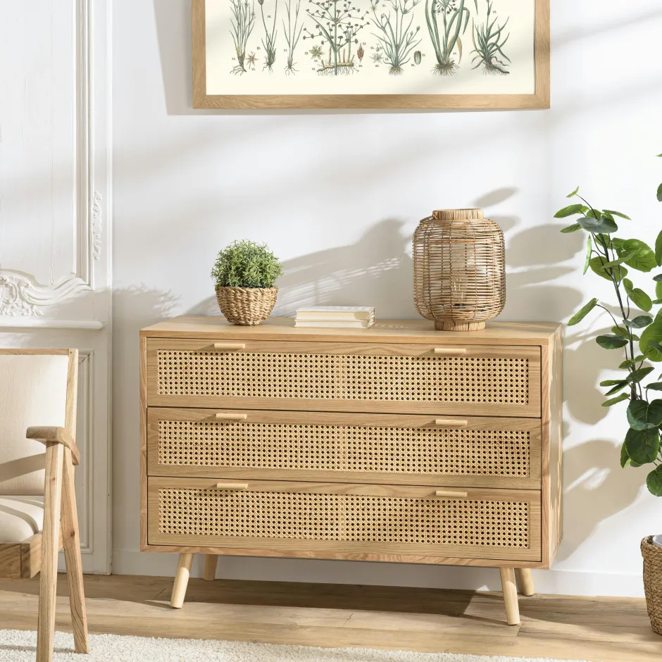 ALGA Commodes En Bois|Commodes Scandinaves|Commode 3 tiroirs bois clair et cannage