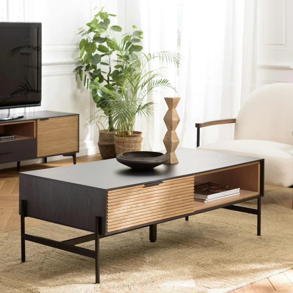 ALMEIRA Tables Basses À Tiroirs|Tables Basses Industrielles|Table de salon 2 tiroirs bois noir et pin