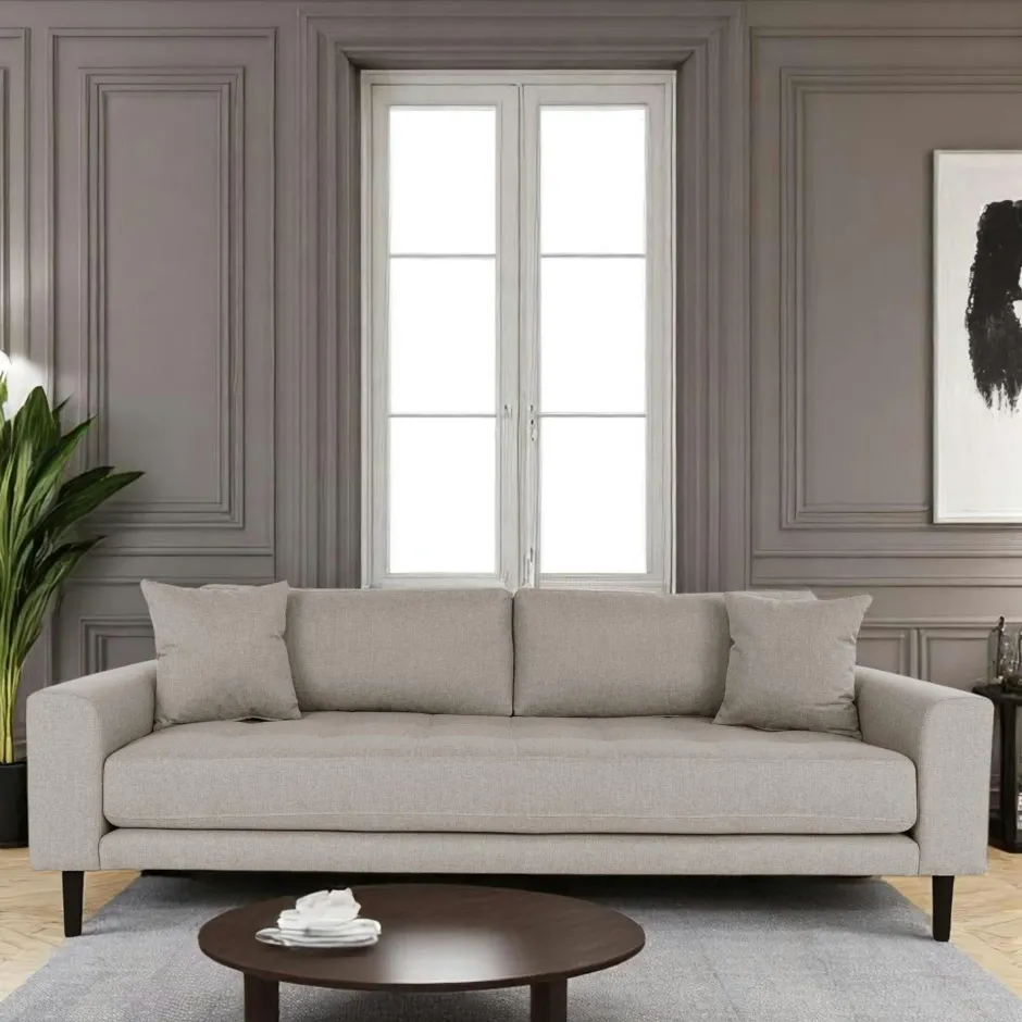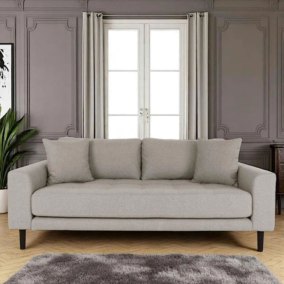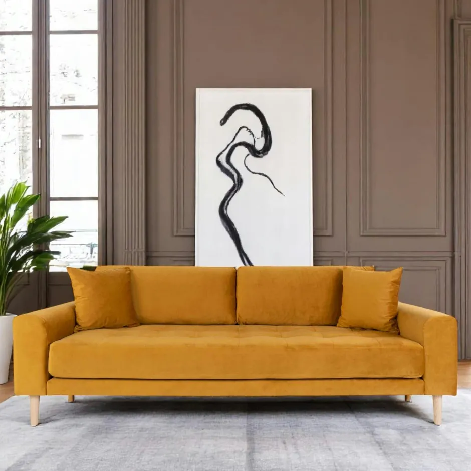| Informations particulières : | 2 coussins décoratifs inclus. Pieds en bois blond. Hauteur d’assise 40 cm, Profondeur d’assise 65 cm. |