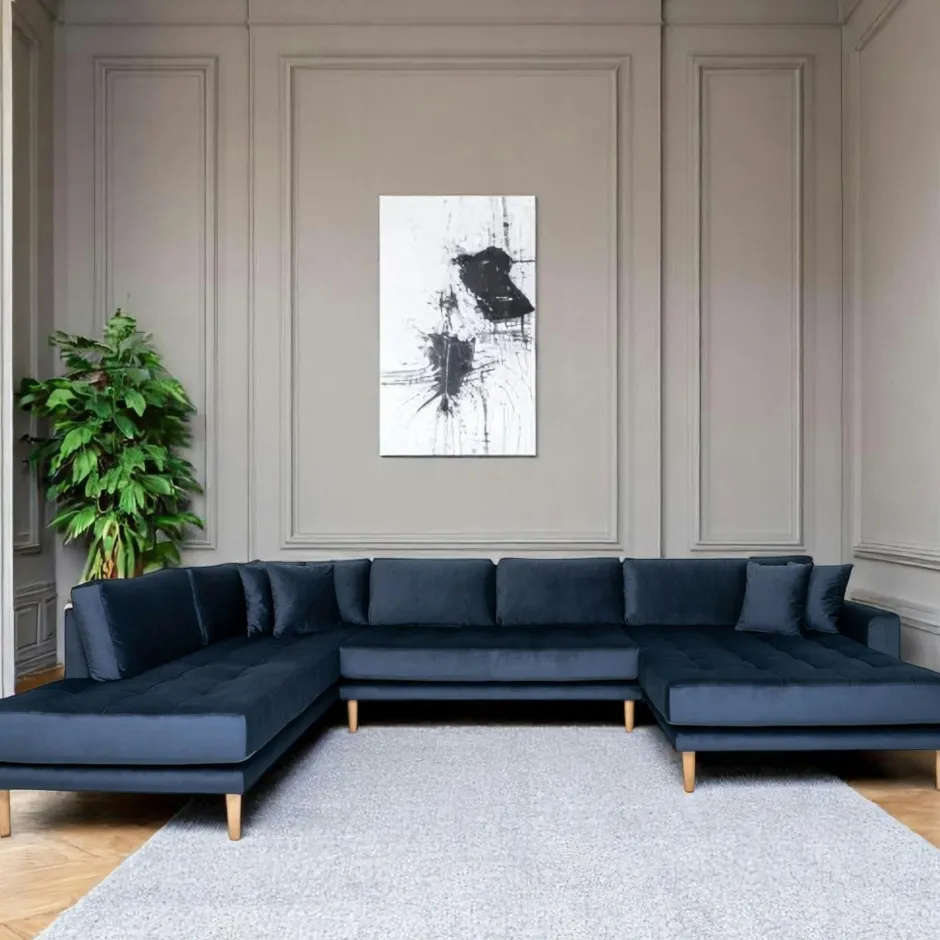 | Informations particulières : | Tissu velours. 4 coussins décoratifs inclus. Pieds en bois blond. Hauteur d’assise 41 cm, Profondeur d’assise 84 cm, et 163 et 210 cm sur les longueurs d’assise. |