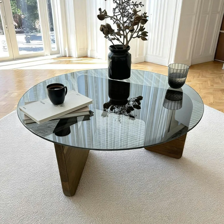 ANZIO Tables Basses En Verre|Tables Basses Rondes|Table basse design en verre fumé – pied bois clair