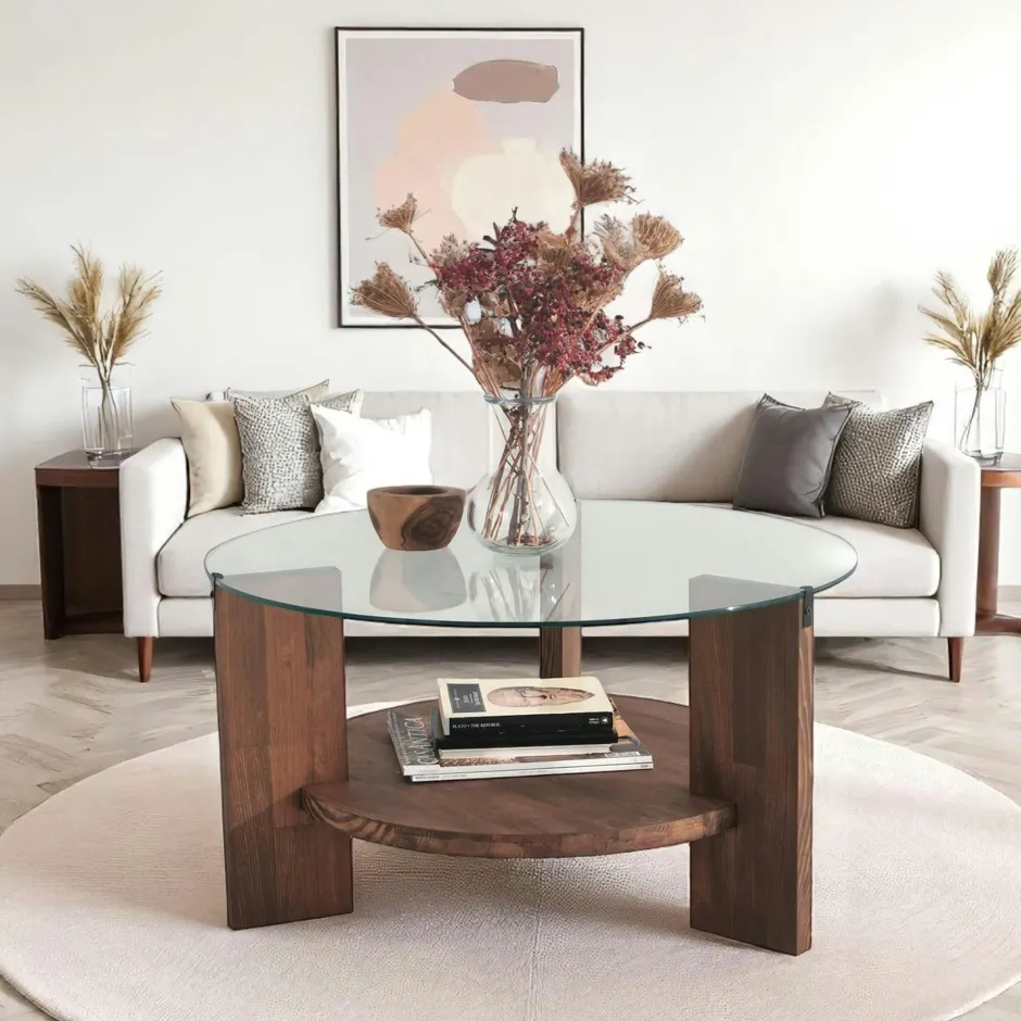 ANZIO Tables Basses En Verre|Tables Basses Rondes|Table basse ronde en verre et bois clair – 2 plateaux