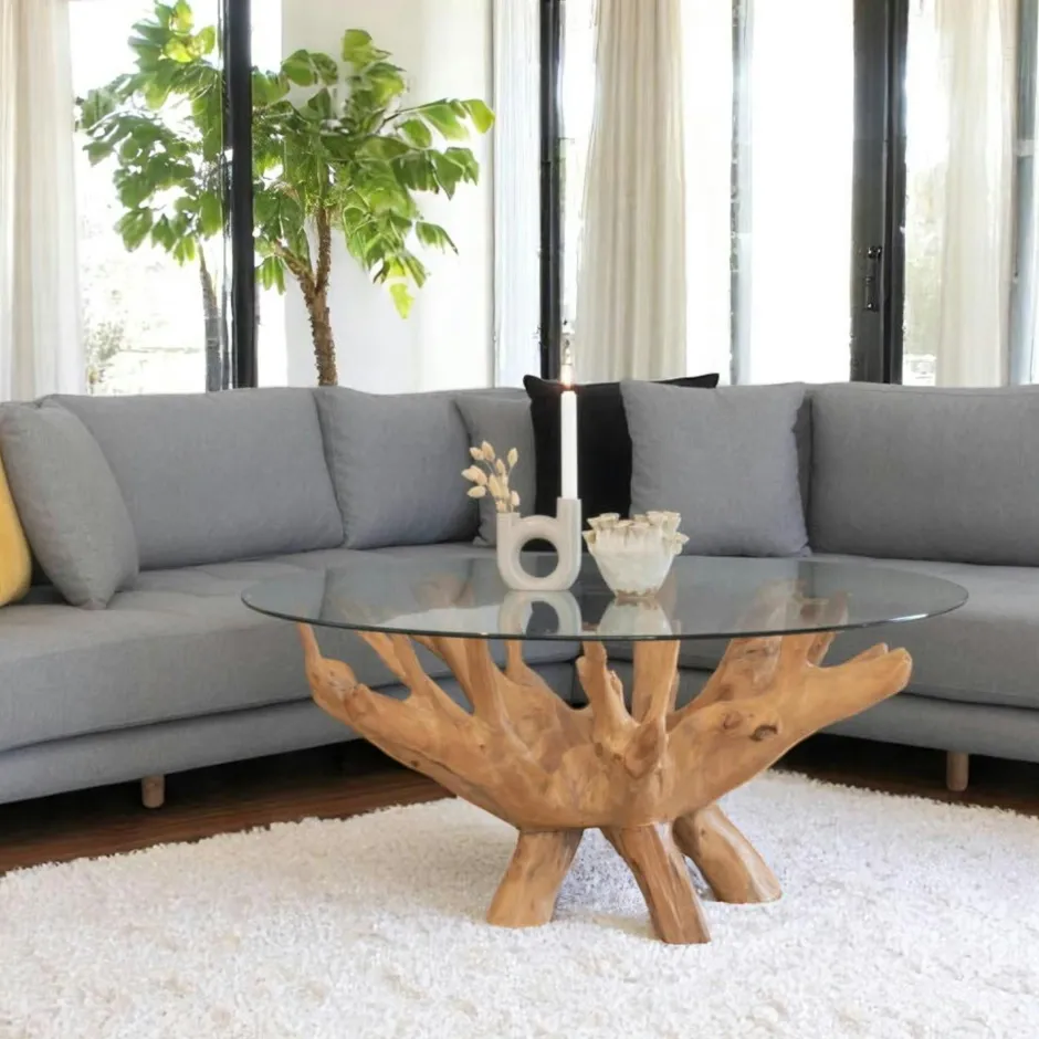 Arizona Tables Basses En Verre|Tables Basses Rondes|Table basse ronde en racine de teck Ø110 cm – plateau verre