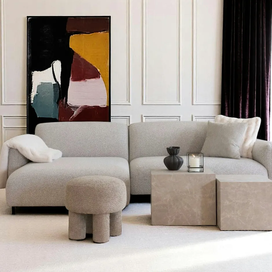 | Informations particulières : | Tissu bouclette. Méridienne gauche. Hauteur d’assise 43 cm, profondeur d’assise 60 cm et 115 cm du côté de la méridienne. Densité : 36 kg par m3 |