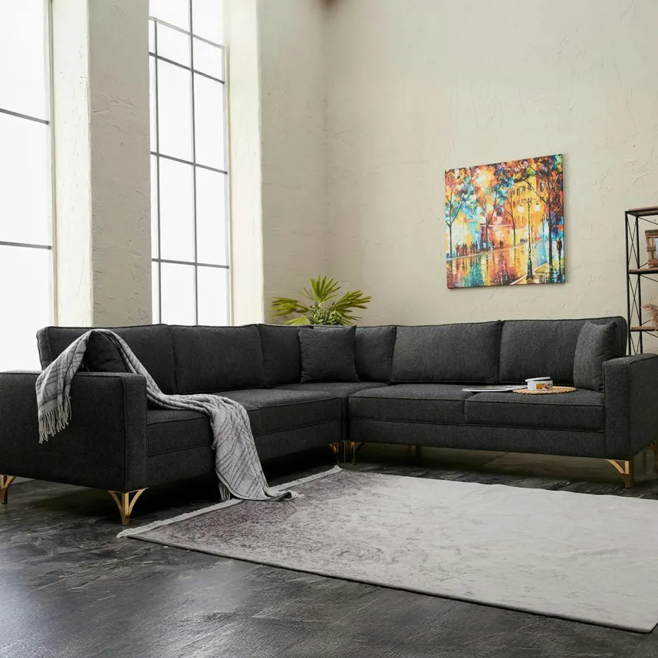 BERLIN Canapés En Tissu|Canapés D’Angle|Canapé d’angle gris foncé, pieds métal doré