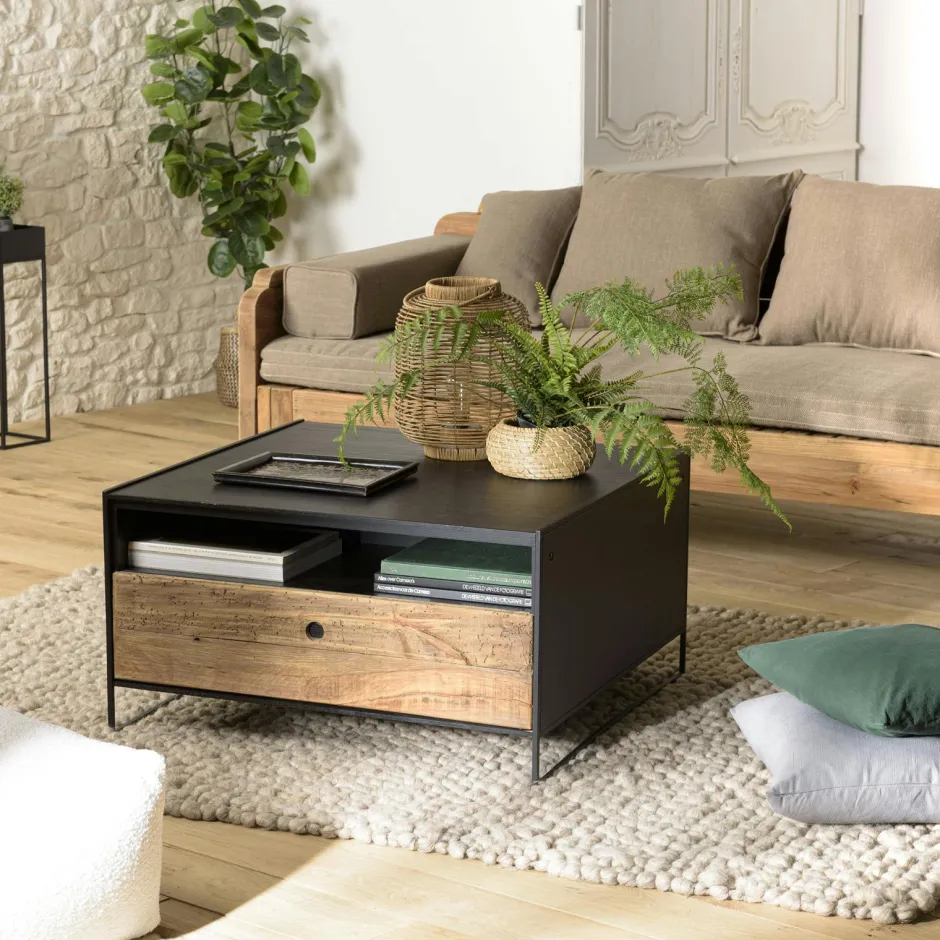 CRACOVIE Tables Basses Vintage|Tables Basses Carrées|Table basse bois recyclé et métal 1 tiroir