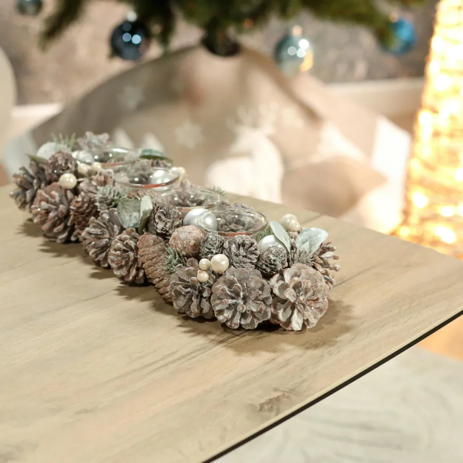 Décorations De Noël·Toute La Déco De Noël|Centre de table de Noël effet givré avec pommes de pin, baies et 4 bougeoirs en verre