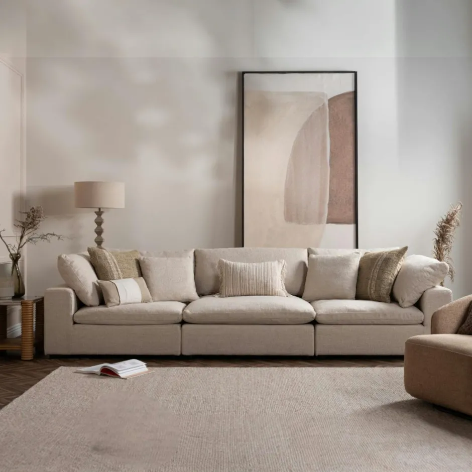 | Informations particulières : | Canapé constitué de 5 éléments. Structure : cadre en bois de pin massif. Panneaux et assise : panneaux en contreplaqué avec coussins garnis de plumes. Coussins de dossier : Mélange de plumes et de fibres polyester. Pieds : pieds en plastique noir. Canapé vendu sans les coussins décoratifs. |