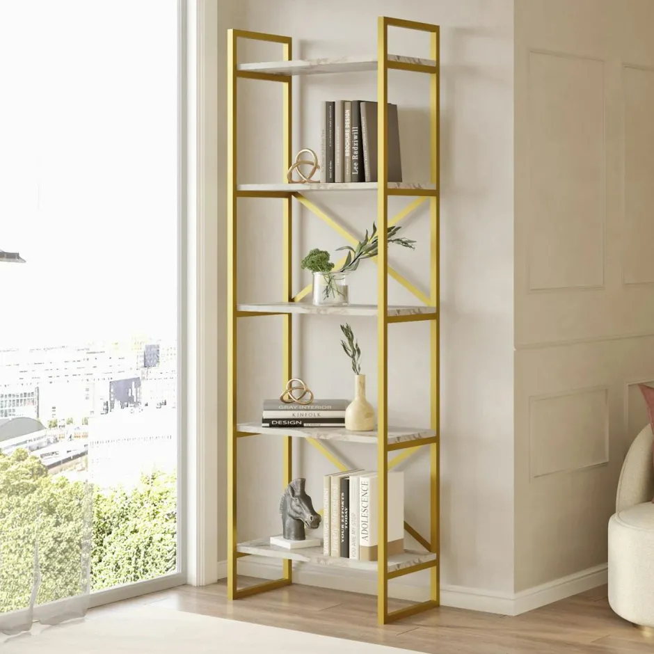 JENA Bibliothèques En Métal|Bibliothèques En Métal|Bibliothèque salon chic effet marbre blanc et métal doré