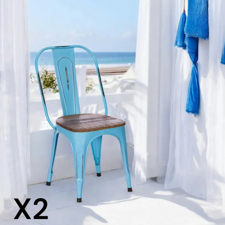 LEEDS Chaises Industrielles|Meubles De Cuisine·Chaises|Chaise industrielle métal bleu bois recyclé (lot de 2)