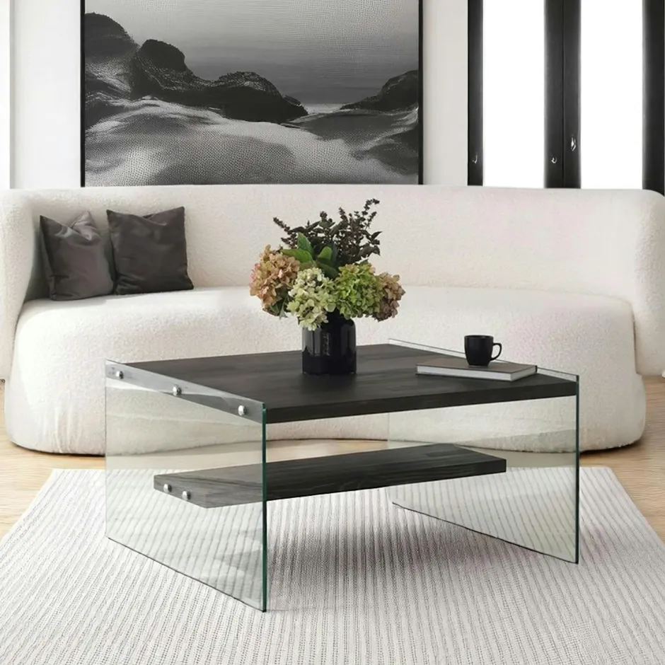 LHASA Tables Basses Carrées|Tables Basses En Verre|Table basse verre et bois – plateaux bruns suspendus