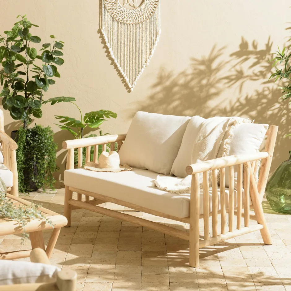 MANAK Canapés 2 Places|Canapés En Tissu|Canapé 2 places exotique teck ajouré et coussins blancs