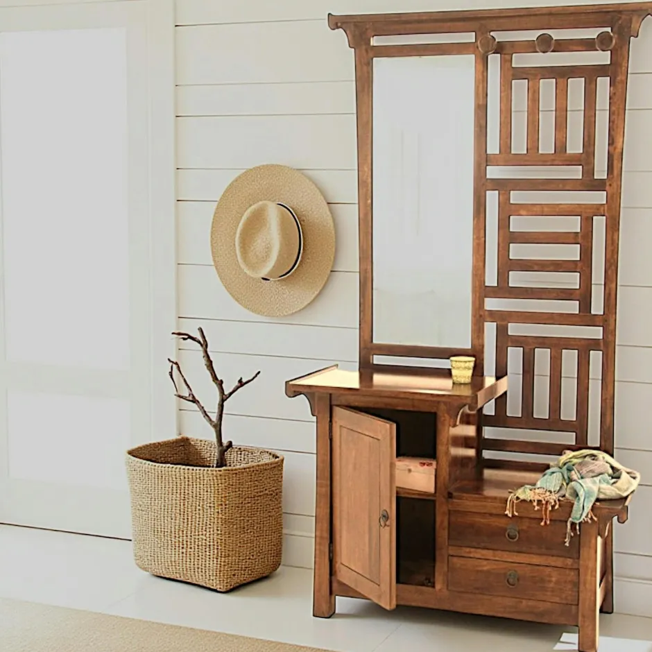 Maori Meubles D’Entrée·Vestiaires|Meubles D’Entrée·Vestiaires / Meubles À Chaussures|Vestiaire Hévéa avec miroir, 1 porte, 2 tiroirs, 3 « boules » porte-manteau 110x40x195cm