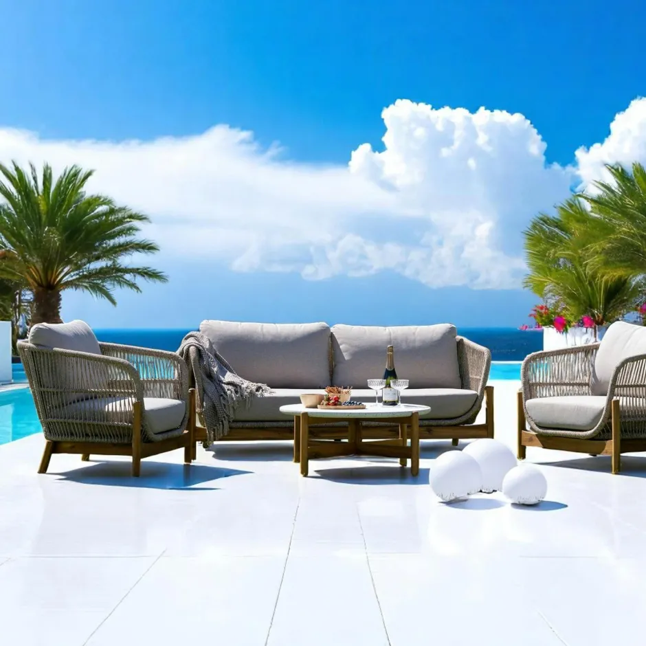MENDOZA Salons De Jardin·Salons Détente|Salon de jardin en bois d’acacia et corde (1 canapé, 2 fauteuils, 1 table basse ronde)
