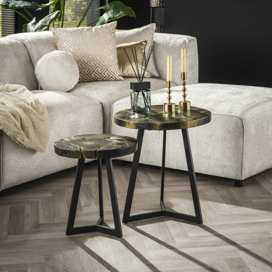 NOVA Tables Basses Rondes|Table gigogne ronde en teck recyclé noir et or (2 pièces)