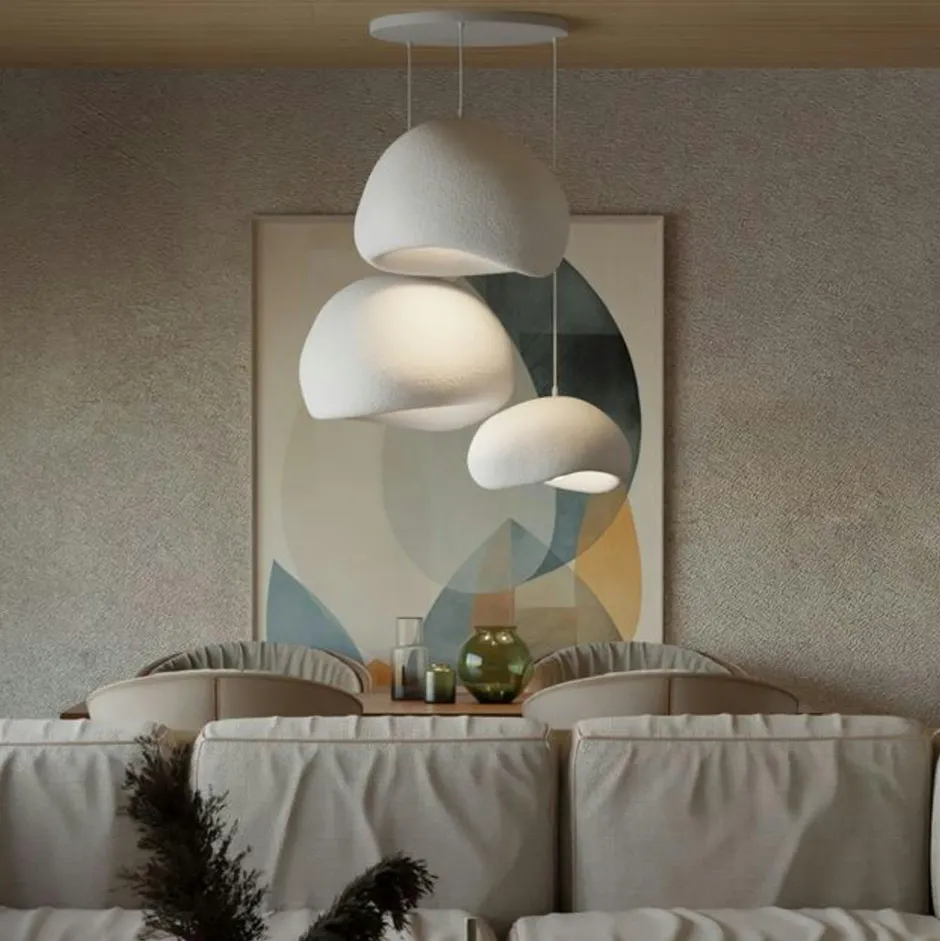 | Informations particulières : | Cette suspension design au style organique s’inspire de l’esthétique japonaise wabi-sabi. Avec ses abat-jour asymétriques, elle allie modernité et minimalisme naturel pour sublimer votre intérieur. Dimensions du petit abat-jour : 34 cm de large, 28 cm de profondeur, et 19 cm de hauteur ; et des deux grands abat-jour : 42 cm de large, 38 cm de profondeur, 28 cm de hauteur. 3 ampoules E27 max 40W, non fournies. Protection IP20. Câble réglable en hauteur entre 68 cm et 120 cm. |