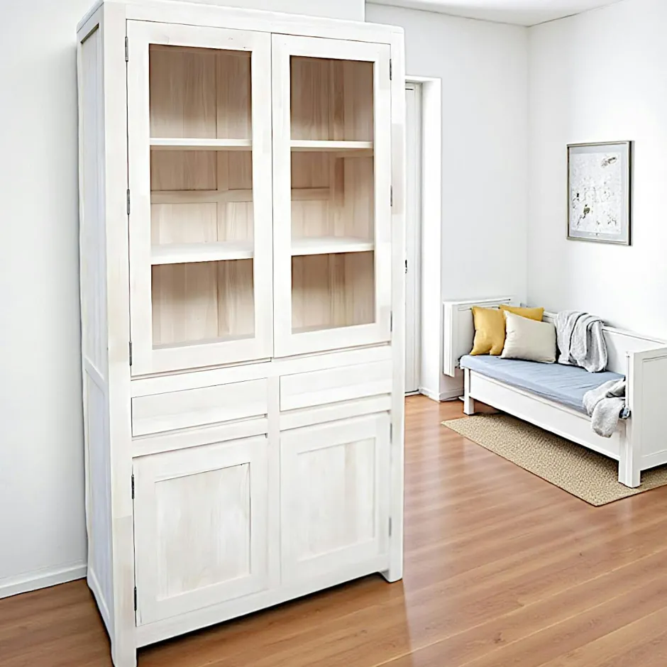 Olga Buffets Contemporains|Buffets Contemporains|Vaisselier Hévéa 4 portes dont 2 vitrées, 2 tiroirs 100x40x190cm