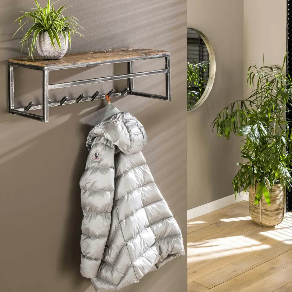 OMSK Meubles D’Entrée·Portemanteaux|Portemanteaux Industriels|Portemanteau mural bois recyclé brut 7 crochets 1 étagère