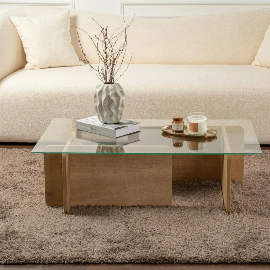 SALTA Tables Basses En Verre|Table basse verre déstructurée – base effet chêne clair