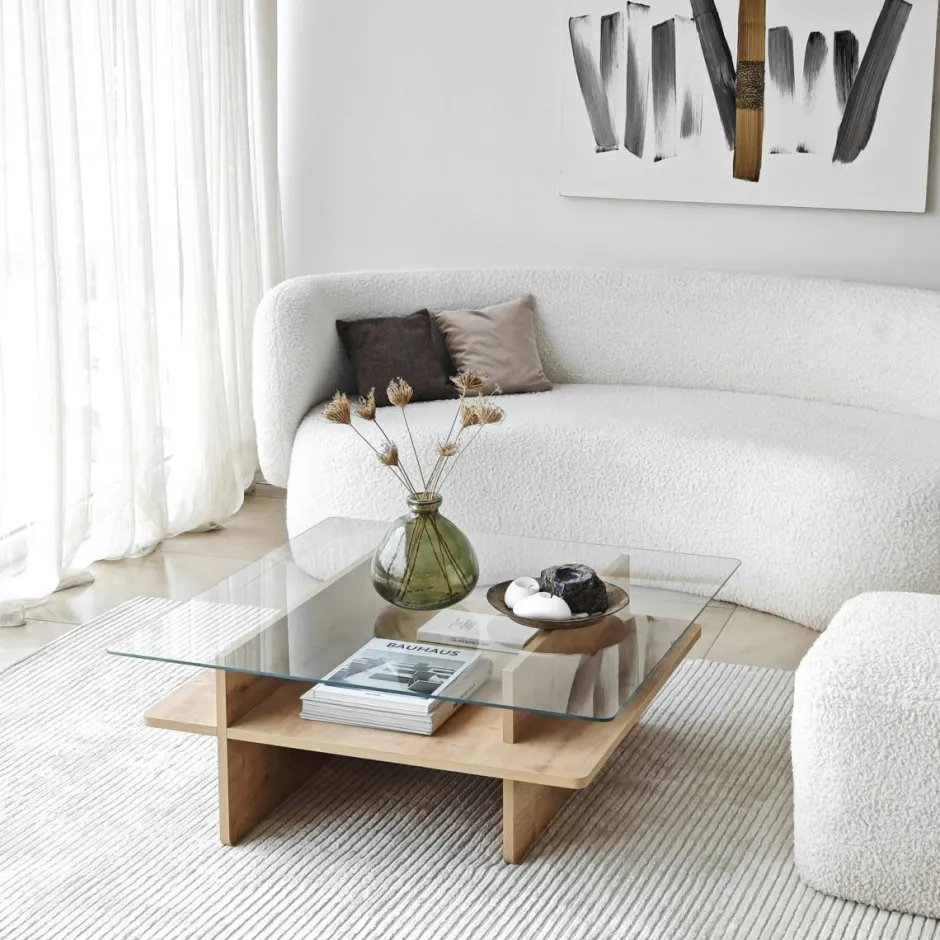 SALTA Tables Basses En Verre|Tables Basses Carrées|Table basse en verre carrée, base effet bois