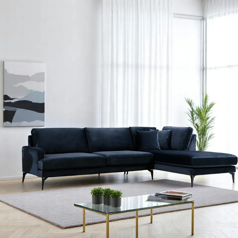 SEATTLE Canapés 3 Places|Canapés D’Angle|Canapé d’angle bleu nuit en velours – côté droit