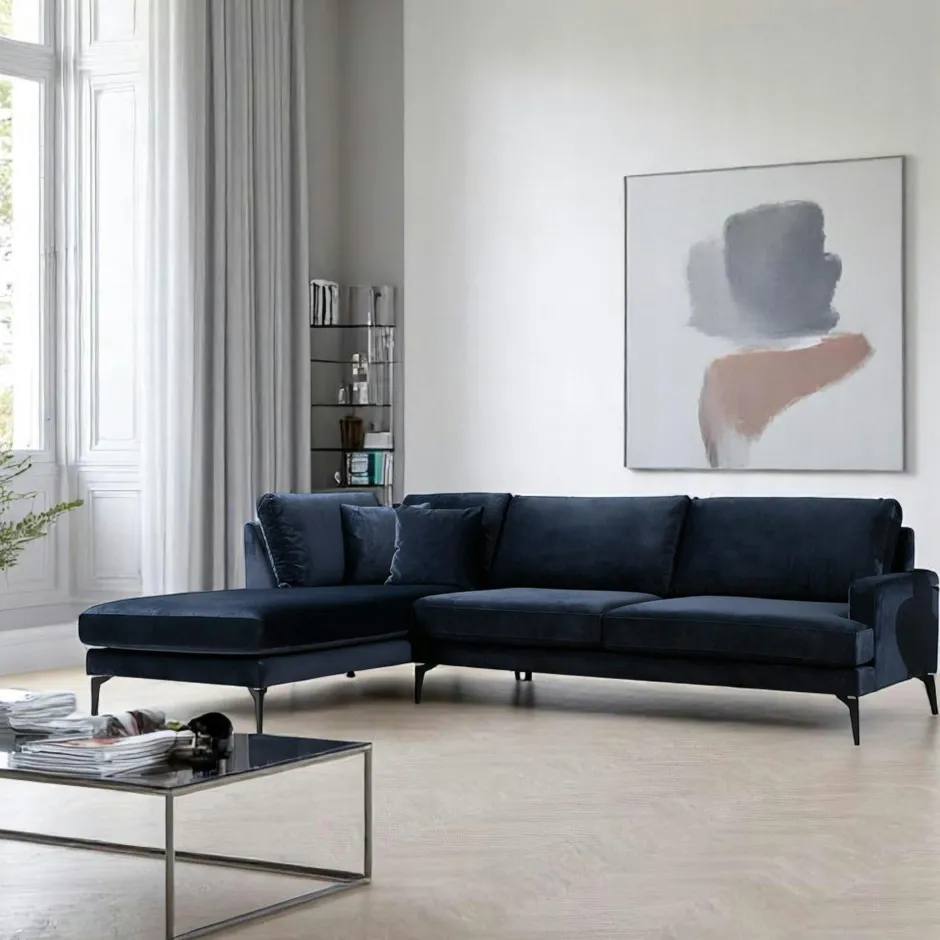 SEATTLE Canapés D’Angle|Canapés 3 Places|Canapé d’angle bleu nuit en velours – côté gauche