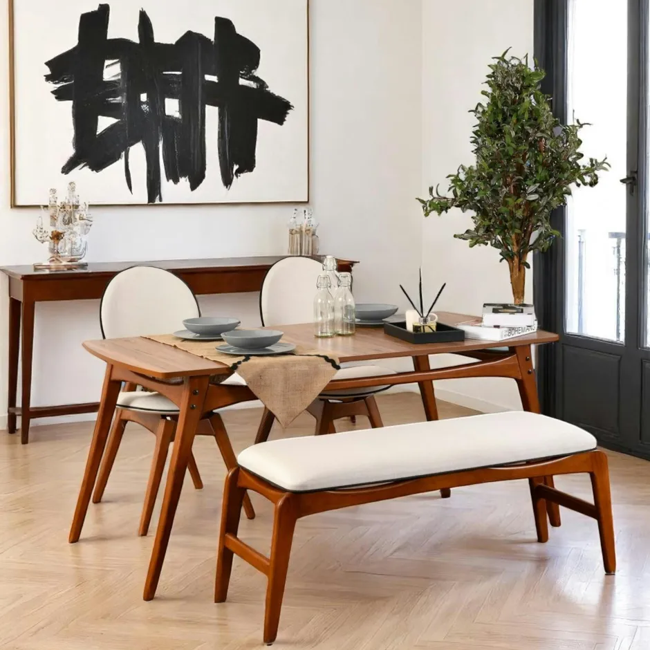 | Composition : | Structure et pieds : bois de charme massif – Plateau : panneau de particules revêtu de mélamine – Chaises et banc en hêtre massif – Revêtement lin. |