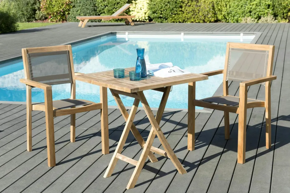 SUMMER Salons De Jardin·Ensemble Repas|Salon de Jardin Table Teck 70x70cm + 2 Fauteuils empilables ref. 30020809