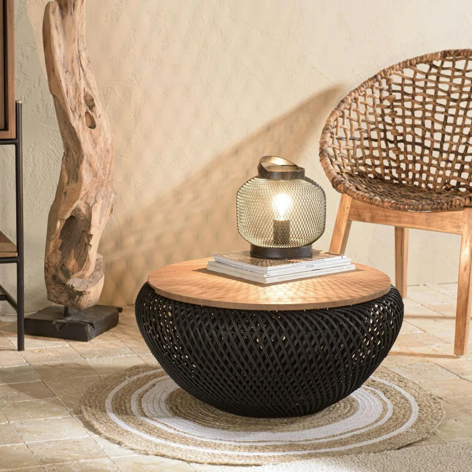 Swing Tables Basses Rondes|Table basse coffre ronde rotin beige et teck recyclé 66 cm