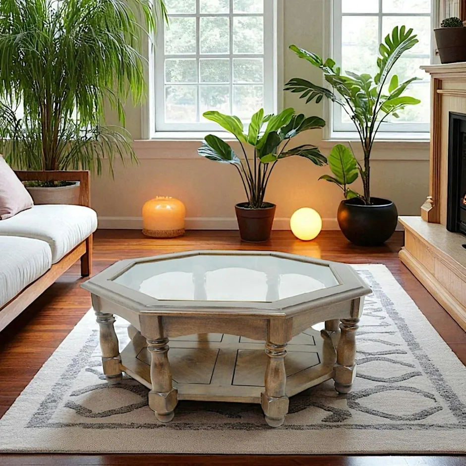 Tradition Tables Basses Rondes|Table basse Octogonale Hévéa double plateaux, 1 plateau haut verre, 1 plateau bas bois D100xH40cm