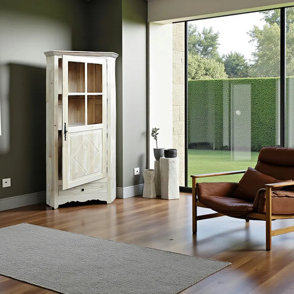 Tradition Vaisseliers En Bois|Vaisseliers En Bois|Buffet / Vaisselier d’angle Hévéa 1 porte partie haute vitrée, 1 tiroir 96x60x190cm