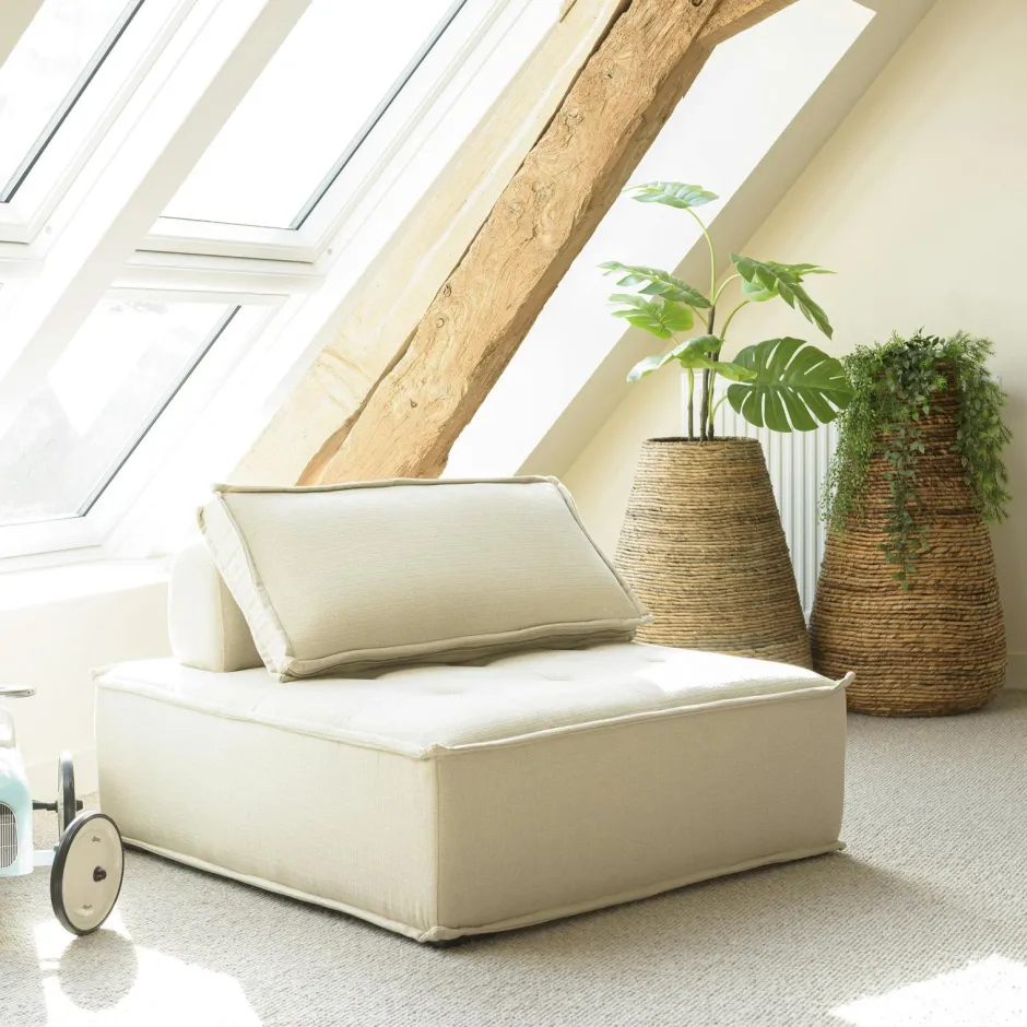 Univers Déco·Design Contemporain|Fauteuils En Tissu|Fauteuil chauffeuse tissu capitonné beige avec coussin