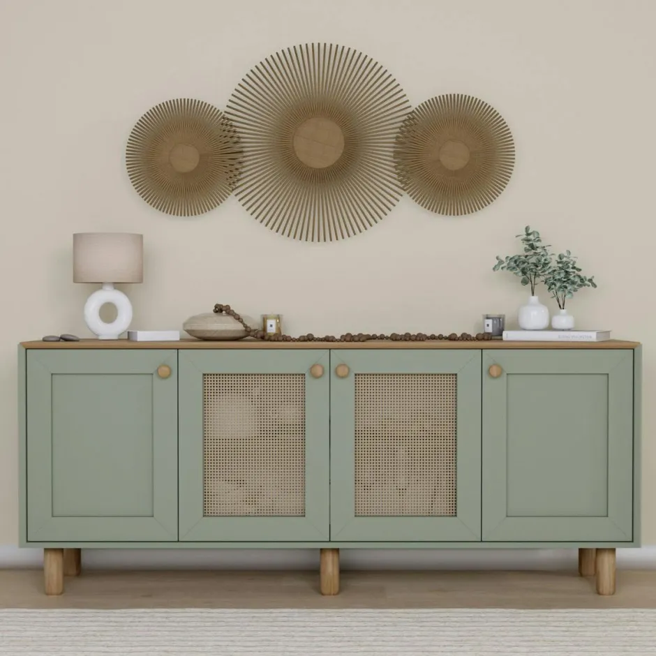 VAREN Buffets Contemporains|Buffets Contemporains|Buffet salle à manger vert sauge, cannage et effet bois