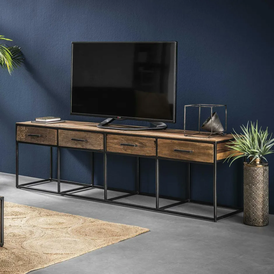WELLINGTON Meubles Tv En Bois|Meuble tv bois recyclé brut acier 4 tiroirs