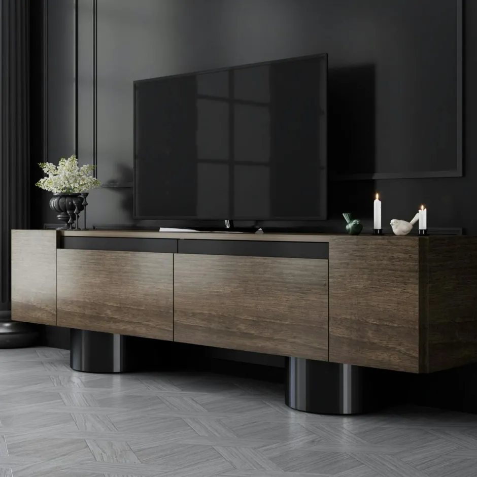 JENA Meubles Tv En Bois|Meuble TV design effet noyer pieds cylindres noirs