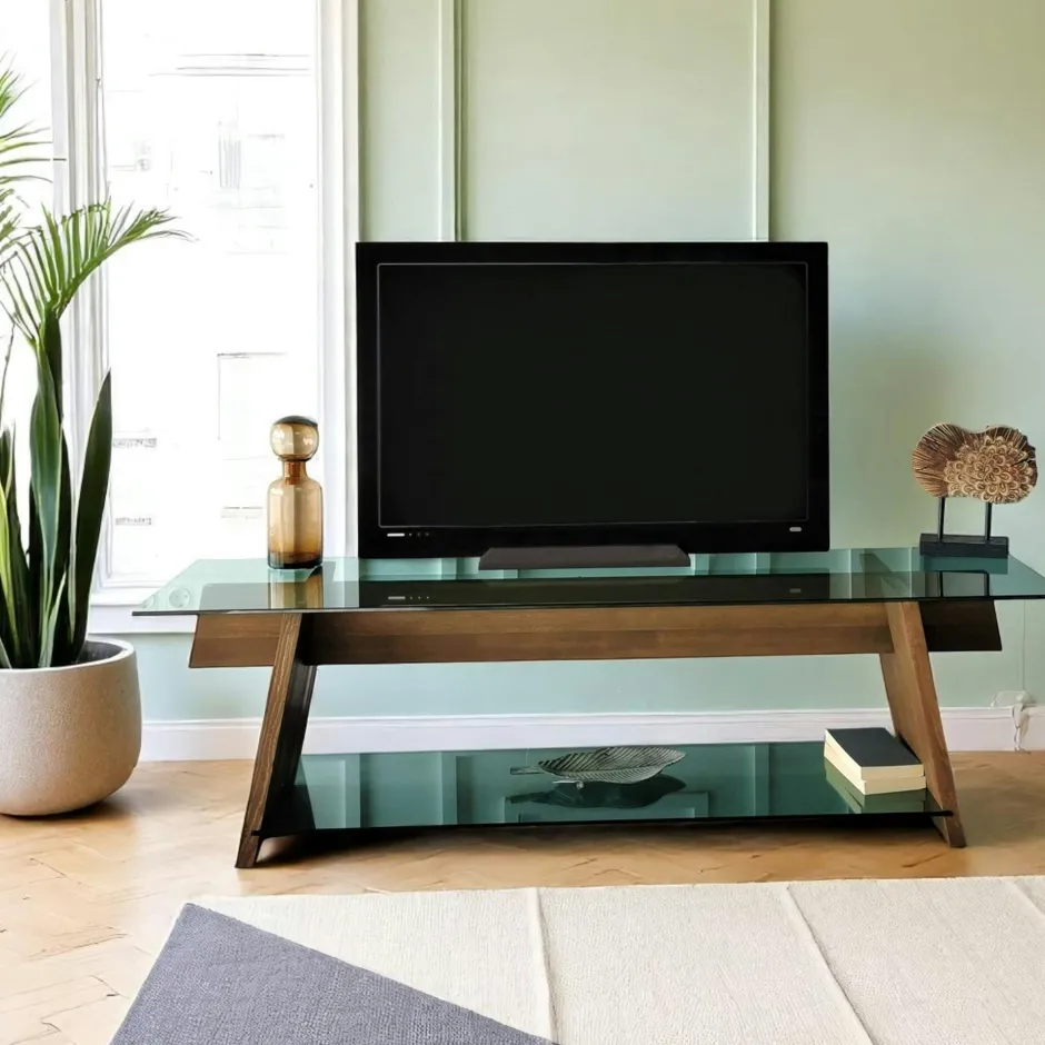 LHASA Meubles Tv En Bois|Meuble TV en bois brun et verre fumé – forme trapèze