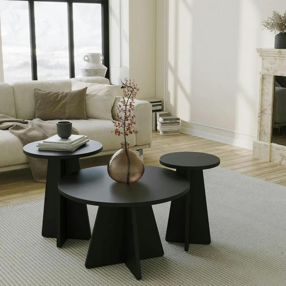 MARFA Tables Basses Rondes|Tables Basses Gigognes|Table basse gigogne noire pieds trapèze – 3 pièces