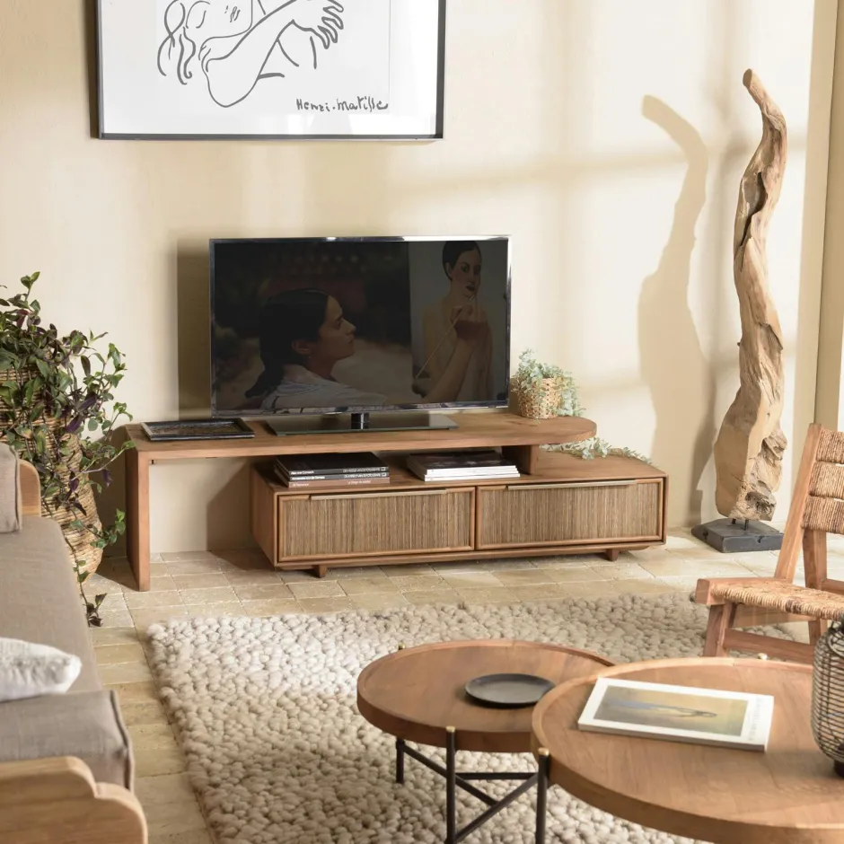 Swing Meubles Tv En Bois|Meuble TV 180 cm en teck recycle 2 tiroirs fibre de coco
